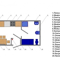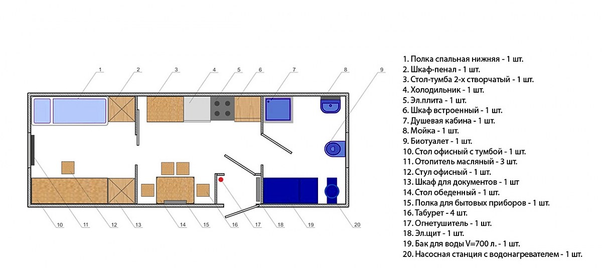 Вагон-дом супервайзера на 1 человека 8000х2500 мм поставляется с наполнением, соответствует всем нормам регламентирующей документации и необходимостям заказчика.
